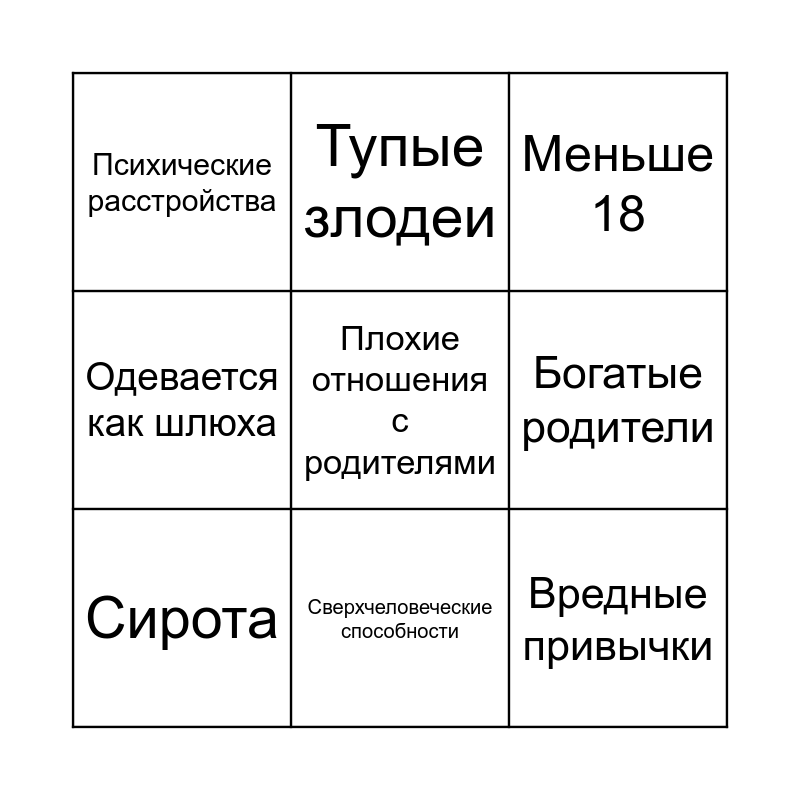 This bingo card has a free space and 8 words: Богатые родители, Меньше 18, Тупые злодеи, Сирота, Психические расстройства, Вредные привычки, Одевается как шлюха and Сверхчеловеческие способности.