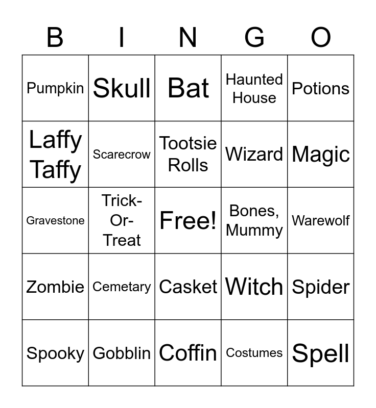 This bingo card has a free space and 45 words: Hocus Pocus, Spell, Monsters, Spooky, Candy, Costumes, Bat, Witch's Brew, Potions, Gobblin, Haunted House, Bones, Mummy, Casket, Cemetary, Cobweb, Coffin, Curse, Gravestone, Graveyard, Magic, Skull, Black Cat, Broomstick, Pumpkin, Starburst, Warewolf, Halloween, Ghost, Witch, Zombie, Skeleton, Spider, Vampire, Jack-O-Lantern, Mask, Trick-Or-Treat, Candy Corn, Skittles, Chocolate, Tootsie Rolls, Laffy Taffy, Wizard, Party, Scarecrow and Frankenstein.