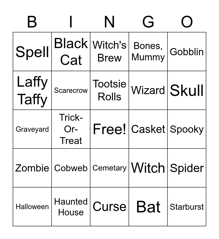 This bingo card has a free space and 45 words: Pumpkin, Starburst, Warewolf, Halloween, Ghost, Bat, Witch's Brew, Potions, Gobblin, Haunted House, Bones, Mummy, Casket, Cemetary, Cobweb, Coffin, Curse, Gravestone, Graveyard, Magic, Skull, Black Cat, Broomstick, Hocus Pocus, Spell, Monsters, Spooky, Candy, Costumes, Witch, Zombie, Skeleton, Spider, Vampire, Jack-O-Lantern, Mask, Trick-Or-Treat, Candy Corn, Skittles, Chocolate, Tootsie Rolls, Laffy Taffy, Wizard, Party, Scarecrow and Frankenstein.