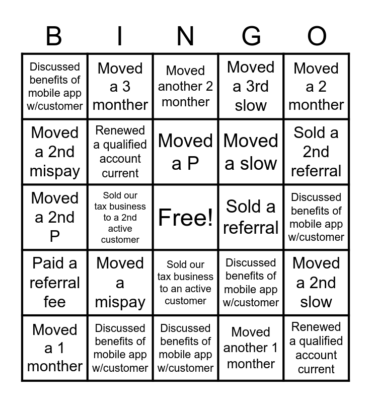 This bingo card has a free space and 24 words: Moved a mispay, Discussed benefits of mobile app w/customer, Moved a P, Moved a 1 monther, Moved a 2 monther, Discussed benefits of mobile app w/customer, Moved a 2nd mispay, Moved a 3 monther, Sold a referral, Sold our tax business to an active customer, Moved a slow, Moved a 2nd P, Discussed benefits of mobile app w/customer, Moved a 2nd slow, Renewed a qualified account current, Moved another 1 monther, Discussed benefits of mobile app w/customer, Moved another 2 monther, Sold a 2nd referral, Sold our tax business to a 2nd active customer, Renewed a qualified account current, Paid a referral fee, Moved a 3rd slow and Discussed benefits of mobile app w/customer.