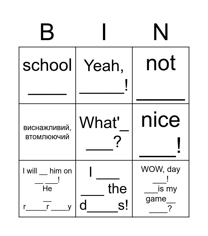 This bingo card has a free space and 8 words: nice ___!, not ____, Yeah, _____!, I will __ him on __ ___! He __ r_____r ____y, school ____, WOW, day ___! ___is my game__ ____?, виснажливий, втомлюючий and I ___ ___ the d____s!.