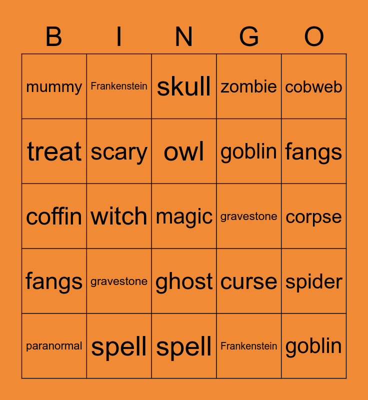 ⚠ This card has duplicate items: black cat (2), Frankenstein (2), witch (2), werewolf (2), trick (2), treat (2), zombie (2), ghost (2), goblin (2), haunted house (2), paranormal (2), chainsaw (2), fangs (2), mummy (2), bat (2), coffin (2), curse (2), cobweb (2), cemetery (2), corpse (2), gravestone (2), magic (2), spider (2), skull (2), owl (2), shadow (2), broomstick (2), cackle (2), cauldron (2), hocus pocus (2), spell (2), superstition (2), wand (2)