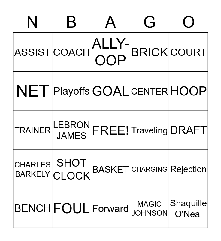 This bingo card has a free space and 24 words: SHOT CLOCK, FOUL, GOAL, BENCH, COURT, ASSIST, NET, COACH, Traveling, BASKET, CENTER, TRAINER, CHARGING, Rejection, Playoffs, MAGIC JOHNSON, DRAFT, ALLY-OOP, HOOP, LEBRON JAMES, Shaquille O'Neal, CHARLES BARKELY, BRICK and Forward.