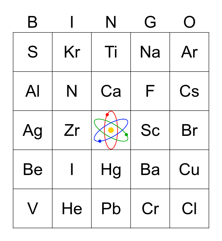 This bingo card has a free space and 62 words: H, He, Li, Be, B, C, N, O, F, Ne, Na, Mg, Al, Si, P, S, Cl, Ar, K, Ca, Sc, Ti, V, Cr, Mn, Fe, Co, Ni, Cu, Zn, Ga, Ge, As, Se, Br, Kr, Rb, Sr, Zr, Y, Ag, Sn, I, Xe, Cs, Ba, W, Ir, Pt, Au, Hg, Pb, Bi, Po, Rn, Fr, Ra, Pm, U, Pu, Am and Np.