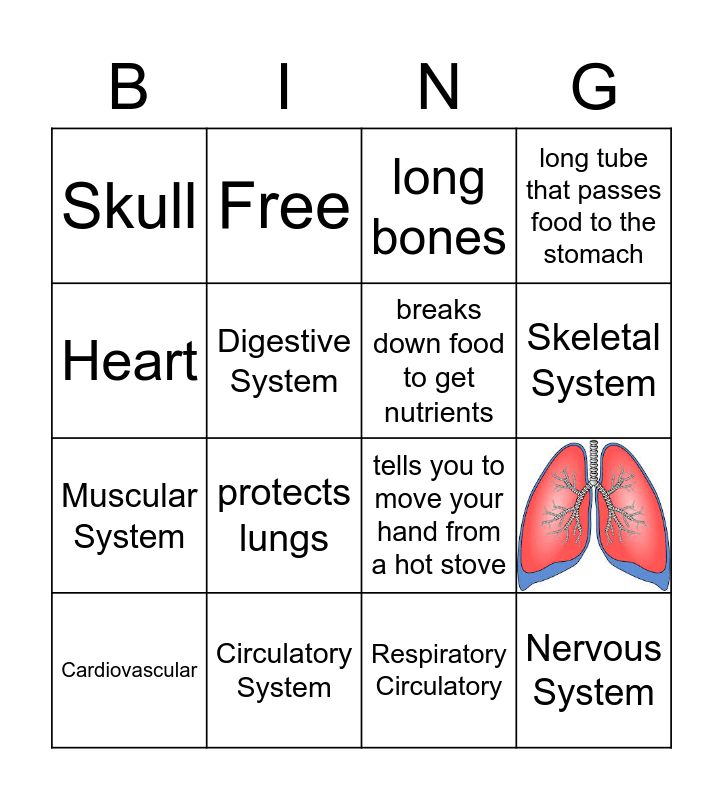 This bingo card has 1 images and 15 words: Circulatory System, long bones, Skull, Muscular System, Free, tells you to move your hand from a hot stove, Respiratory Circulatory, Heart, Digestive System, Cardiovascular, long tube that passes food to the stomach, protects lungs, Skeletal System, breaks down food to get nutrients and Nervous System.