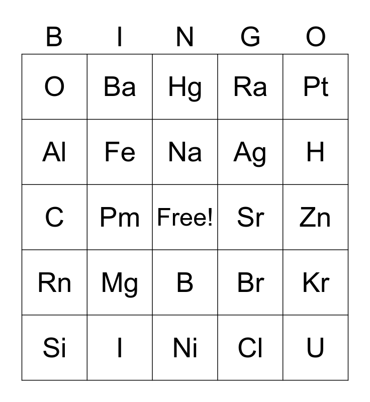 This bingo card has a free space and 50 words: Ca, U, He, Ni, Mg, Be, Ba, Au, Al, Sc, Fe, Ra, Kr, Br, Cr, Li, Na, Sr, W, Pt, Pm, Cl, O, Ag, Mn, K, H, Ti, Hg, B, Ba, Pu, Pb, Ga, I, F, Xe, Cu, Am, Zn, P, Sn, Bi, Cs, Si, C, N, Zr, Rn and s.