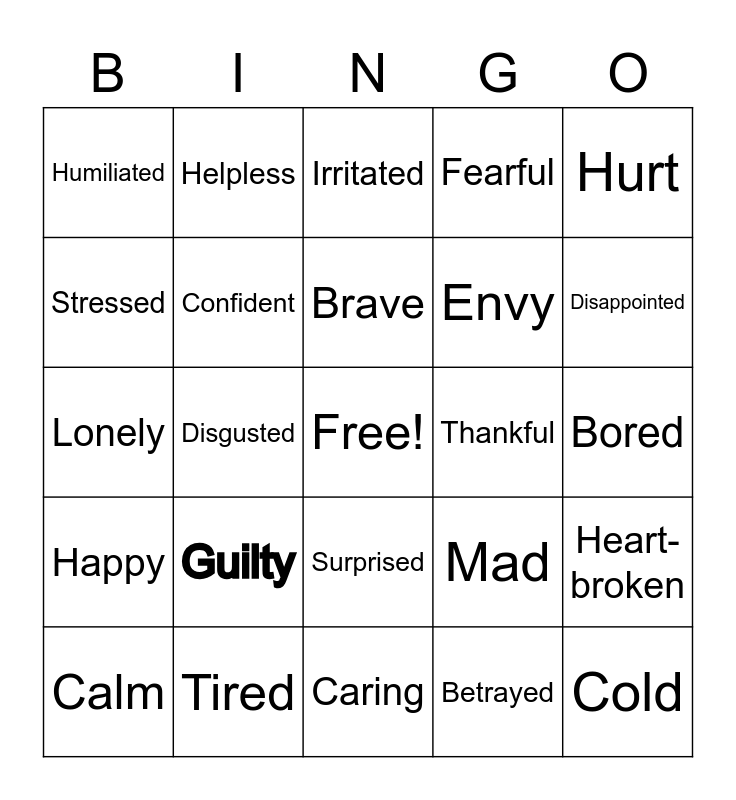 This bingo card has a free space and 24 words: Guilty, Tired, Brave, Calm, Hurt, Humiliated, Stressed, Helpless, Thankful, Surprised, Envy, Lonely, Mad, Heart-broken, Confident, Betrayed, Bored, Irritated, Disappointed, Disgusted, Cold, Happy, Fearful and Caring.