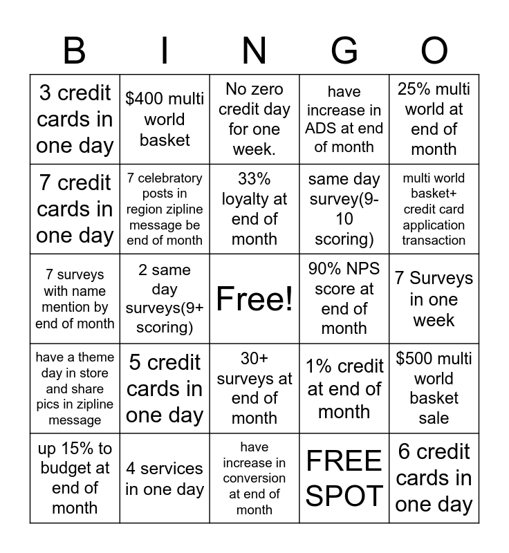This bingo card has a free space and 24 words: 5 credit cards in one day, 4 services in one day, 33% loyalty at end of month, up 15% to budget at end of month, 25% multi world at end of month, 3 credit cards in one day, 7 credit cards in one day, $400 multi world basket, 90% NPS score at end of month, 30+ surveys at end of month, same day survey(9-10 scoring), 7 surveys with name mention by end of month, 1% credit at end of month, $500 multi world basket sale, 7 celebratory posts in region zipline message be end of month, FREE SPOT, 7 Surveys in one week, No zero credit day for one week., multi world basket+ credit card application transaction, 2 same day surveys(9+ scoring), 6 credit cards in one day, have a theme day in store and share pics in zipline message, have increase in ADS at end of month and have increase in conversion at end of month.