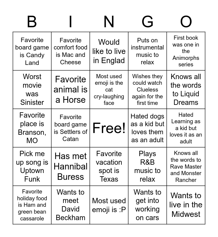 This bingo card has a free space and 24 words: Has met Hannibal Buress, Wants to meet David Beckham, Most used emoji is the cat cry-laughing face, Favorite holiday food is Ham and green bean cassarole, First book was one in the Animorphs series, Favorite board game is Candy Land, Worst movie was Sinister, Favorite comfort food is Mac and Cheese, Hated dogs as a kid but loves them as an adult, Favorite vacation spot is Texas, Wishes they could watch Clueless again for the first time, Favorite place is Branson, MO, Plays R&B music to relax, Knows all the words to Rave Master and Monster Rancher, Favorite animal is a Horse, Wants to get into working on cars, Hated Learning as a kid but loves it as an adult, Would like to live in Englad, Knows all the words to Liquid Dreams, Favorite board game is Settlers of Catan, Wants to live in the Midwest, Pick me up song is Uptown Funk, Puts on instrumental music to relax and Most used emoji is :P.