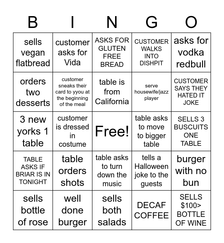 This bingo card has a free space and 24 words: table orders shots, well done burger, table is from California, sells bottle of rose, asks for vodka redbull, sells vegan flatbread, orders two desserts, customer asks for Vida, table asks to move to bigger table, table asks to turn down the music, serve housewife/jazz player, 3 new yorks 1 table, tells a Halloween joke to the guests, burger with no bun, customer sneaks their card to yyou at the beginning of the meal, DECAF COFFEE, SELLS 3 BUSCUITS ONE TABLE, ASKS FOR GLUTEN FREE BREAD, CUSTOMER SAYS THEY HATED IT JOKE, customer is dressed in costume, SELLS $100> BOTTLE OF WINE, TABLE ASKS IF BRIAR IS IN TONIGHT, CUSTOMER WALKS INTO DISHPIT and sells both salads.