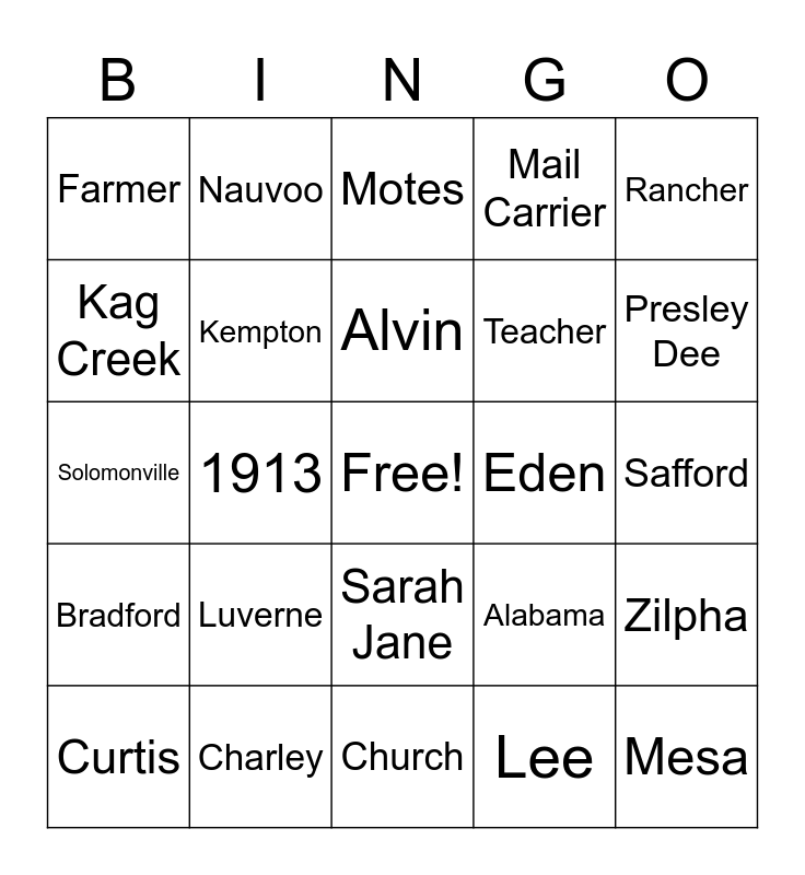 This bingo card has a free space and 24 words: Luverne, Charley, Alvin, Curtis, Rancher, Farmer, Kag Creek, Nauvoo, Eden, Sarah Jane, Teacher, Solomonville, Alabama, Zilpha, Kempton, Lee, Safford, Motes, Presley Dee, 1913, Mesa, Bradford, Mail Carrier and Church.