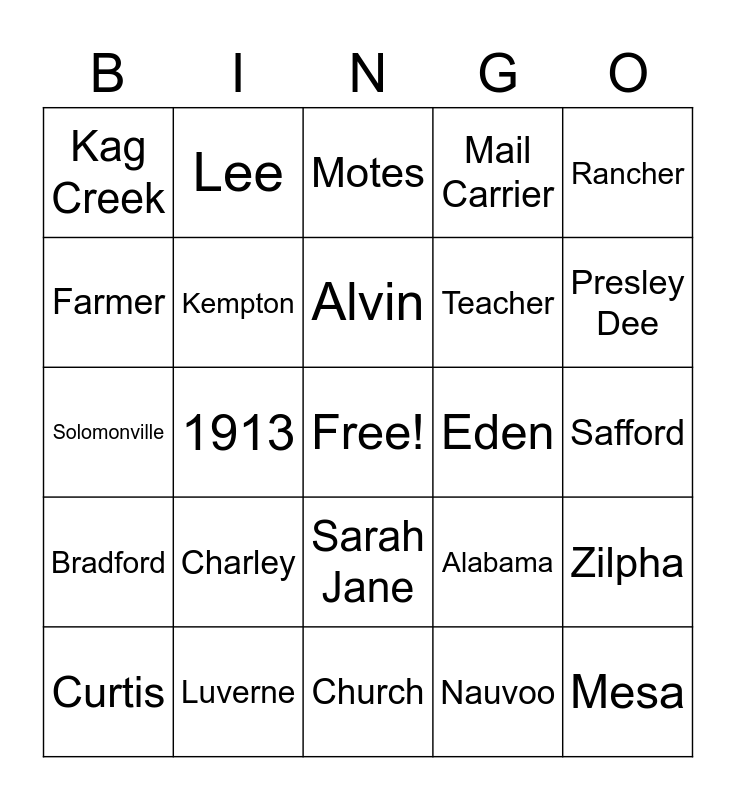 This bingo card has a free space and 24 words: Charley, Luverne, Alvin, Curtis, Rancher, Kag Creek, Farmer, Lee, Eden, Sarah Jane, Teacher, Solomonville, Alabama, Zilpha, Kempton, Nauvoo, Safford, Motes, Presley Dee, 1913, Mesa, Bradford, Mail Carrier and Church.