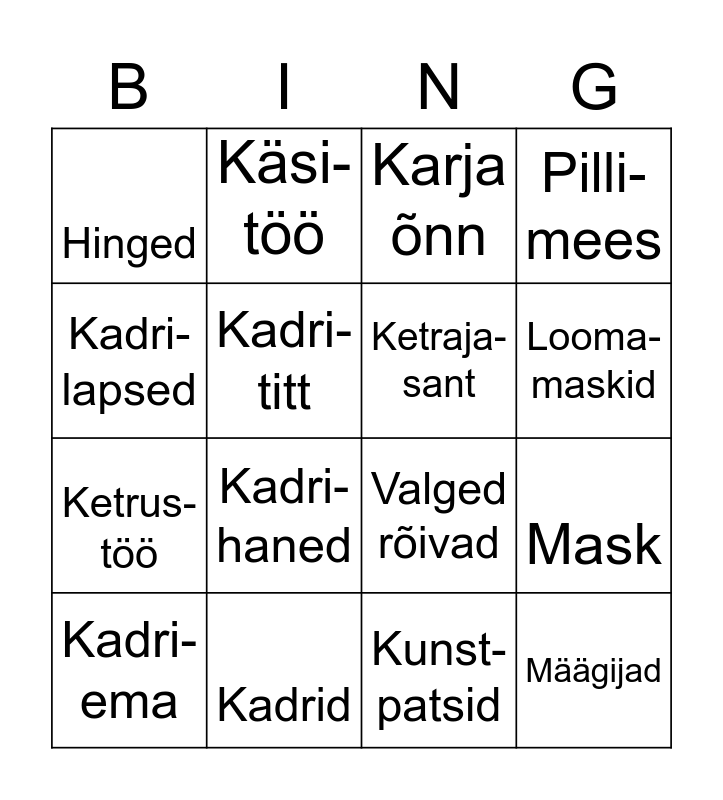 This bingo card has 16 words: Kadrid, Mask, Karja õnn, Hinged, Ketrus- töö, Käsi- töö, Valged rõivad, Kunst- patsid, Kadri- lapsed, Kadri- titt, Kadri- ema, Pilli- mees, Kadri- haned, Looma- maskid, Ketraja- sant and Määgijad.