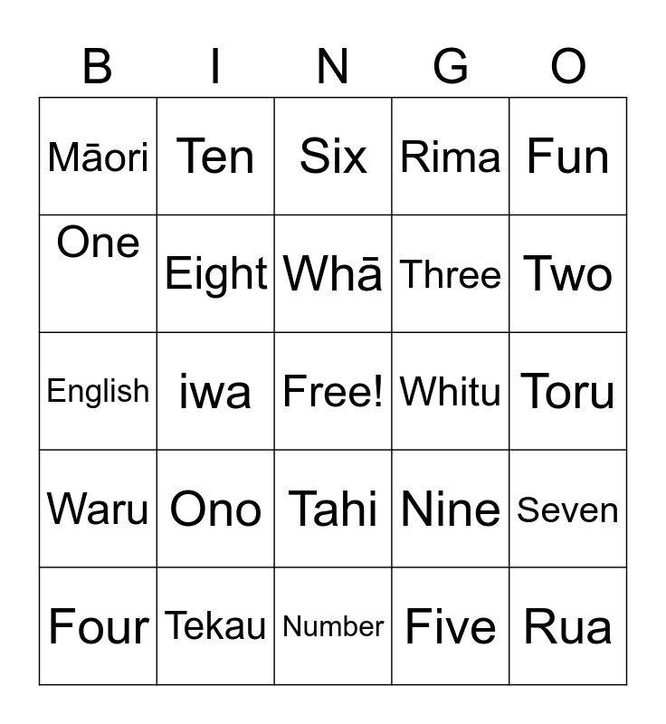 This bingo card has a free space and 24 words: Ono, Tekau, Whā, Four, Fun, Māori, One, Ten, Whitu, Tahi, Three, English, Nine, Seven, Eight, Five, Toru, Six, Two, iwa, Rua, Waru, Rima and Number.
