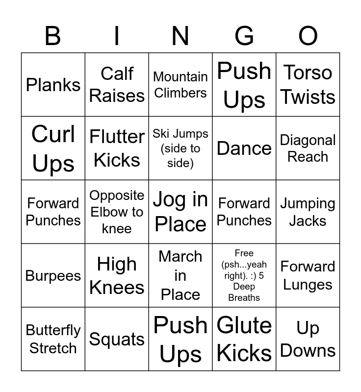 This bingo card has 25 words: High Knees, Push Ups, Ski Jumps (side to side), Butterfly Stretch, Torso Twists, Planks, Curl Ups, Calf Raises, Forward Punches, March in Place, Dance, Forward Punches, Free (psh...yeah right). :) 5 Deep Breaths, Forward Lunges, Flutter Kicks, Up Downs, Jumping Jacks, Mountain Climbers, Diagonal Reach, Opposite Elbow to knee, Jog in Place, Squats, Burpees, Push Ups and Glute Kicks.