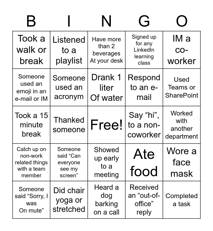 This bingo card has a free space and 24 words: Someone said “Can everyone see my screen”, Did chair yoga or stretched, Drank 1 liter Of water, Someone said “Sorry, I was On mute”, IM a co-worker, Took a walk or break, Someone used an emoji in an e-mail or IM, Listened to a playlist, Say “hi”, to a non-coworker, Showed up early to a meeting, Respond to an e-mail, Took a 15 minute break, Ate food, Wore a face mask, Someone used an acronym, Received an “out-of-office” reply, Worked with another department, Have more than 2 beverages At your desk, Used Teams or SharePoint, Thanked someone, Completed a task, Catch up on non-work related things with a team member, Signed up for any LinkedIn learning class and Heard a dog barking on a call.