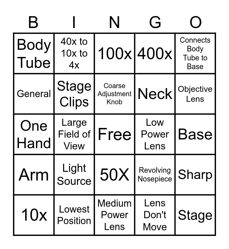 This bingo card has a free space and 36 words: Fine Adjustment Knob, Two Hands, 4x to 10x to 40x, Stage Clips, Revolving Nosepiece, Arm, Coarse Adjustment Knob, High Power Knob, Connects Body Tube to Base, Ocular Lens, Large Field of View, 400x, Small Objects Look Larger, Low Power Lens, Objective Lens, Body Tube, 40x, Light Source, Stage, 100x, Base, Sharp, Lowest Position, 10x, Medium Power Lens, 40x to 10x to 4x, One Hand, Large Objects Look Small, Neck, General, Blurry, Order Doesn't Matter, Lens Don't Move, 50X, Small Field of View and 5X.
