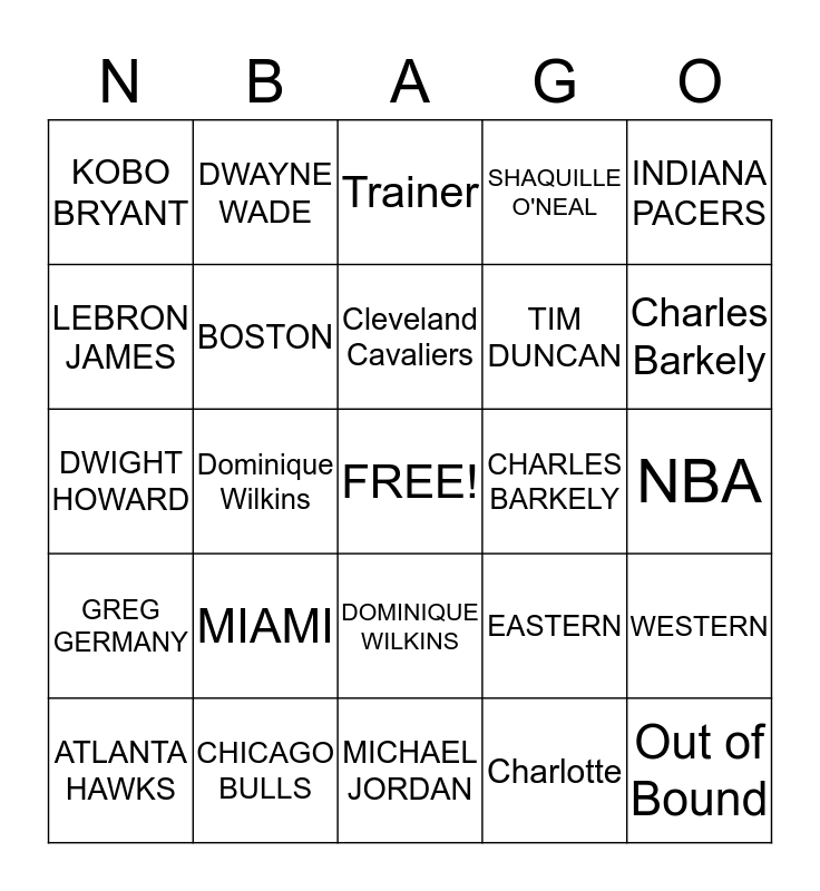This bingo card has a free space and 24 words: MIAMI, CHICAGO BULLS, Cleveland Cavaliers, ATLANTA HAWKS, INDIANA PACERS, KOBO BRYANT, LEBRON JAMES, DWAYNE WADE, CHARLES BARKELY, DOMINIQUE WILKINS, TIM DUNCAN, DWIGHT HOWARD, EASTERN, WESTERN, BOSTON, Charlotte, NBA, Trainer, Charles Barkely, Dominique Wilkins, Out of Bound, GREG GERMANY, SHAQUILLE O'NEAL and MICHAEL JORDAN.