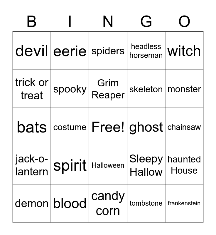 This bingo card has a free space and 24 words: spirit, blood, Grim Reaper, demon, witch, devil, trick or treat, eerie, ghost, Halloween, skeleton, bats, Sleepy Hallow, haunted House, spooky, tombstone, chainsaw, spiders, monster, costume, frankenstein, jack-o-lantern, headless horseman and candy corn.