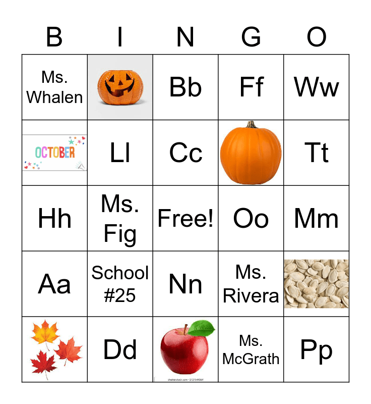 This bingo card has 6 images, a free space and 18 words: School #25, Cc, Ms. McGrath, Ww, Ms. Whalen, Bb, Oo, Mm, Hh, Ll, Ms. Rivera, Dd, Ff, Tt, Aa, Ms. Fig, Nn and Pp.