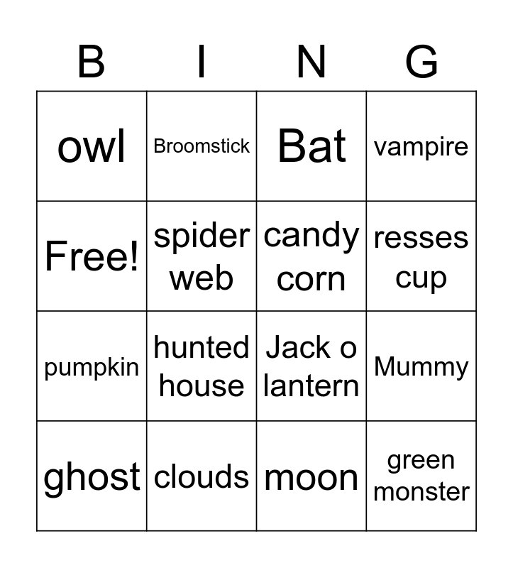 This bingo card has 16 words: clouds, Mummy, Bat, owl, pumpkin, Broomstick, Jack o lantern, moon, Free!, spider web, ghost, vampire, hunted house, resses cup, candy corn and green monster.