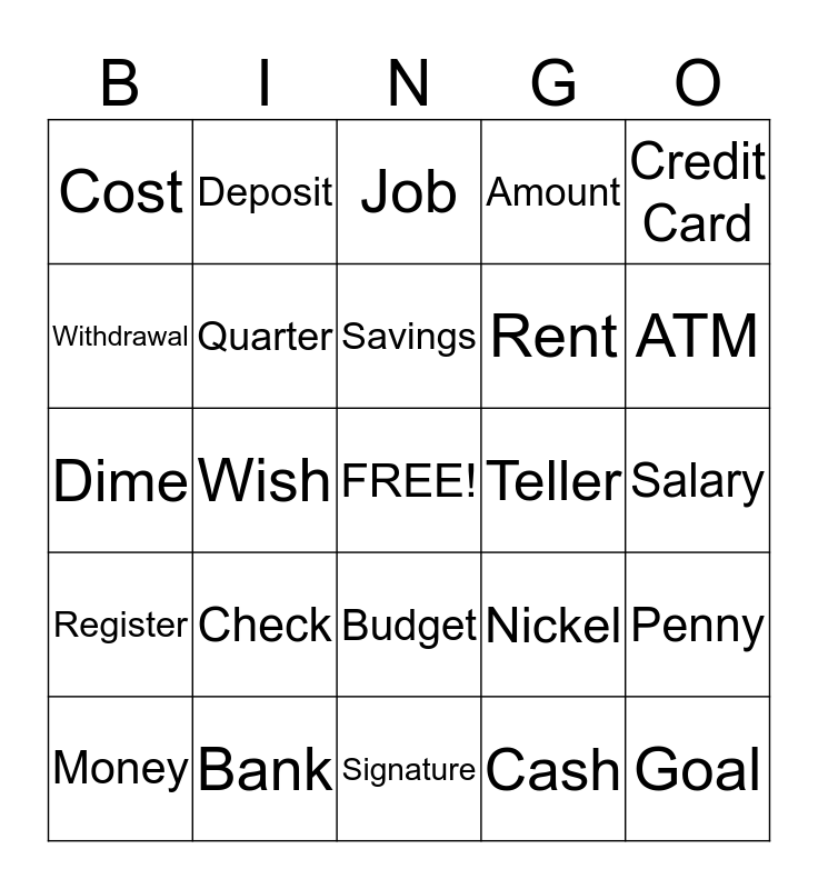 This bingo card has a free space and 24 words: Check, Bank, Savings, Money, Credit Card, Cost, Withdrawal, Deposit, Teller, Budget, Rent, Dime, Nickel, Penny, Quarter, Cash, Salary, Job, ATM, Wish, Goal, Register, Amount and Signature.