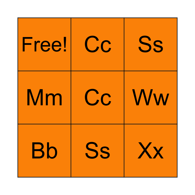 This bingo card has 9 words: Bb, Ss, Cc, Mm, Free!, Ww, Cc, Xx and Ss.