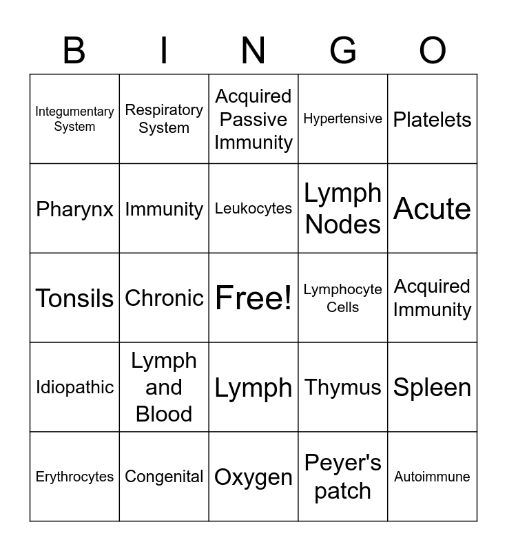 This bingo card has a free space and 25 words: Lymph and Blood, Oxygen, Leukocytes, Erythrocytes, Platelets, Integumentary System, Pharynx, Respiratory System, Lymphocyte Cells, Lymph, Lymph Nodes, Tonsils, Thymus, Spleen, Immunity, Natural Immunity, Acquired Immunity, Acquired Passive Immunity, Acute, Chronic, Autoimmune, Congenital, Idiopathic, Hypertensive and Peyer's patch.