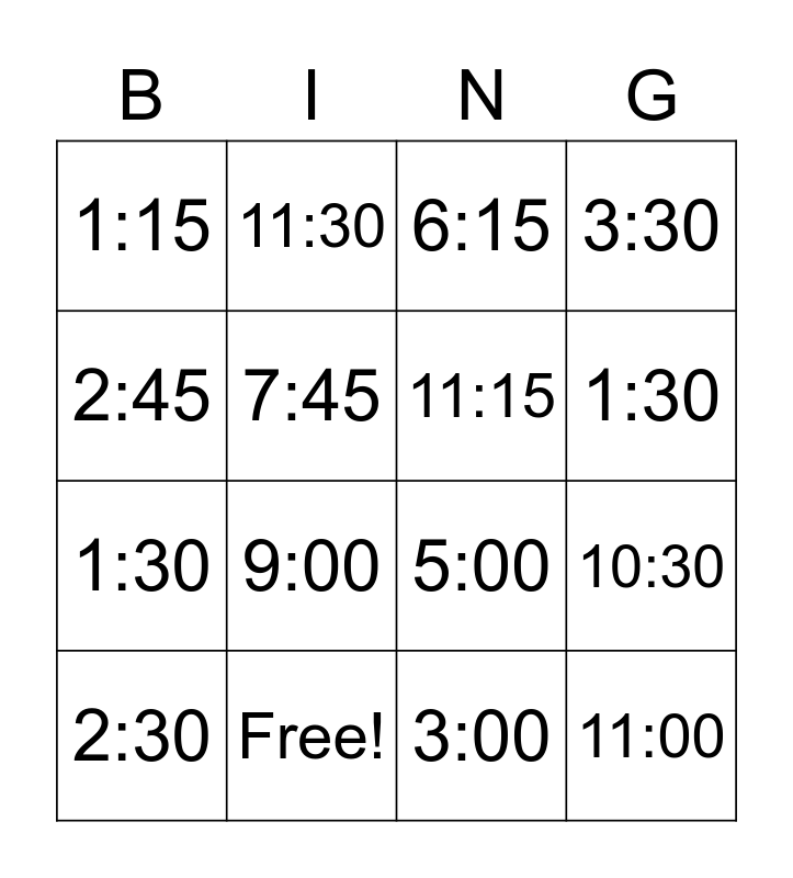 This bingo card has 25 words: 12:00, 6:45, 1:30, 4:15, 2:45, 1:15, 7:45, 11:30, Free!, 8:15, 1:30, 5:00, 9:15, 10:45, 11:15, 4:45, 3:00, 6:15, 9:00, 10:30, 2:30, 10:15, 11:00, 3:30 and 8:00.