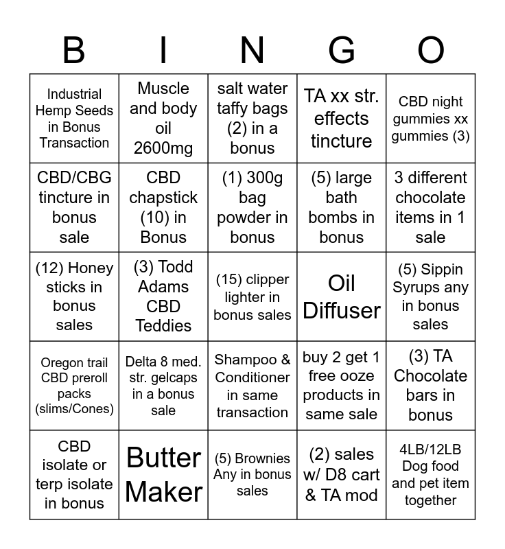 This bingo card has 30 words: Butter Maker, (5) Nine mile Botanicals, (3) Todd Adams CBD Teddies, (2) Alpha tincture 2250mg, Industrial Hemp Seeds in Bonus Transaction, salt water taffy bags (2) in a bonus, CBD chapstick (10) in Bonus, Shampoo & Conditioner in same transaction, Oil Diffuser, (5) Brownies Any in bonus sales, (5) Sippin Syrups any in bonus sales, (15) clipper lighter in bonus sales, (2) sales w/ D8 cart & TA mod, 4LB/12LB Dog food and pet item together, 3 different chocolate items in 1 sale, 1/2 kilo in bonus sale, buy 2 get 1 free ooze products in same sale, Oregon trail CBD preroll packs (slims/Cones), Delta 8 med. str. gelcaps in a bonus sale, CBD night gummies xx gummies (3), (12) Honey sticks in bonus sales, (12) DT products in bonus sales, Muscle and body oil 2600mg, (5) large bath bombs in bonus, CBD/CBG tincture in bonus sale, TA xx str. effects tincture, (3) TA Chocolate bars in bonus, CBD isolate or terp isolate in bonus, (1) 300g bag powder in bonus and 3 korthal items in one sale that is bonus.