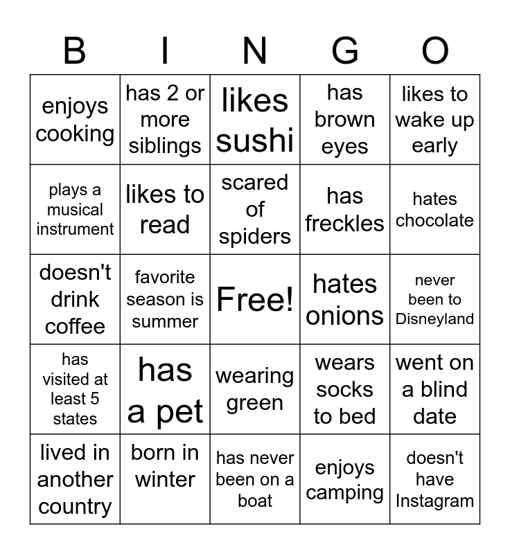 This bingo card has a free space and 24 words: has a pet, born in winter, scared of spiders, lived in another country, likes to wake up early, enjoys cooking, plays a musical instrument, has 2 or more siblings, hates onions, wearing green, has freckles, doesn't drink coffee, wears socks to bed, went on a blind date, likes to read, enjoys camping, never been to Disneyland, likes sushi, hates chocolate, favorite season is summer, doesn't have Instagram, has visited at least 5 states, has brown eyes and has never been on a boat.