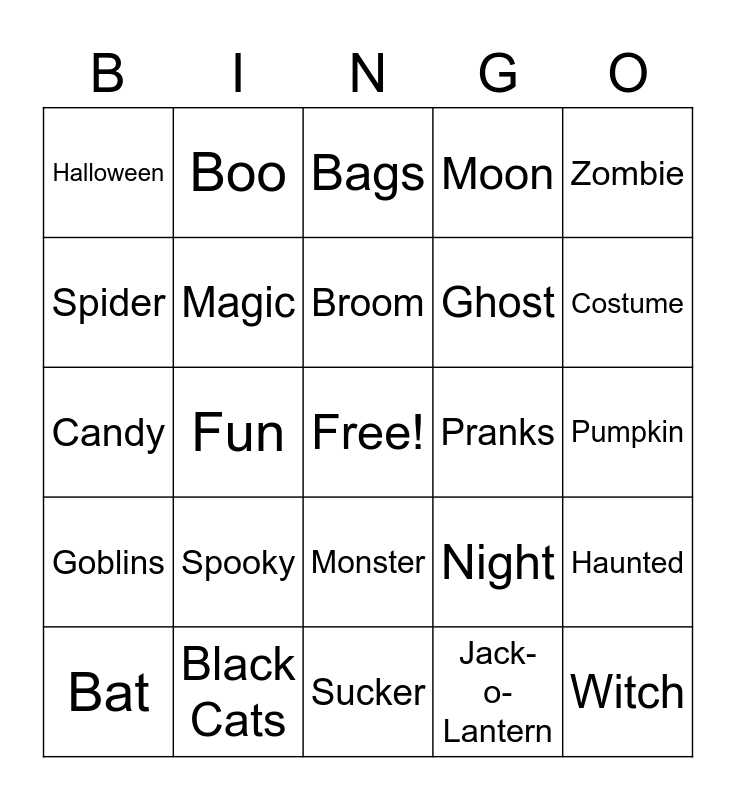 This bingo card has a free space and 24 words: Spooky, Black Cats, Broom, Bat, Zombie, Halloween, Spider, Boo, Pranks, Monster, Ghost, Candy, Night, Haunted, Magic, Jack- o- Lantern, Pumpkin, Bags, Costume, Fun, Witch, Goblins, Moon and Sucker.