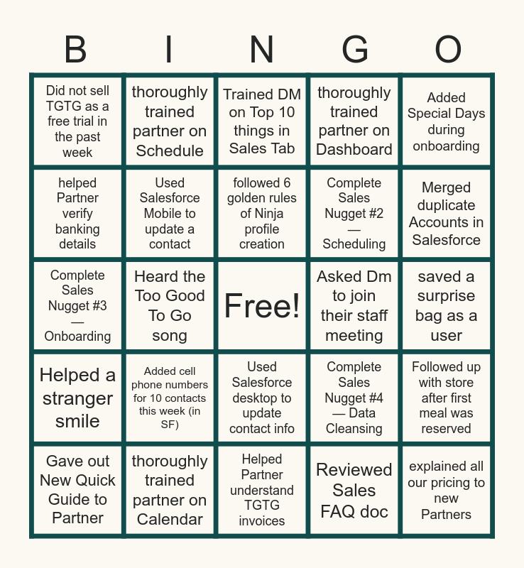 This bingo card has a free space and 24 words: Added cell phone numbers for 10 contacts this week (in SF), thoroughly trained partner on Calendar, followed 6 golden rules of Ninja profile creation, Gave out New Quick Guide to Partner, Added Special Days during onboarding, Did not sell TGTG as a free trial in the past week, helped Partner verify banking details, thoroughly trained partner on Schedule, Asked Dm to join their staff meeting, Used Salesforce desktop to update contact info, Complete Sales Nugget #2 — Scheduling, Complete Sales Nugget #3 — Onboarding, Complete Sales Nugget #4 — Data Cleansing, Followed up with store after first meal was reserved, Used Salesforce Mobile to update a contact, Reviewed Sales FAQ doc, saved a surprise bag as a user, Trained DM on Top 10 things in Sales Tab, Merged duplicate Accounts in Salesforce, Heard the Too Good To Go song, explained all our pricing to new Partners, Helped a stranger smile, thoroughly trained partner on Dashboard and Helped Partner understand TGTG invoices.