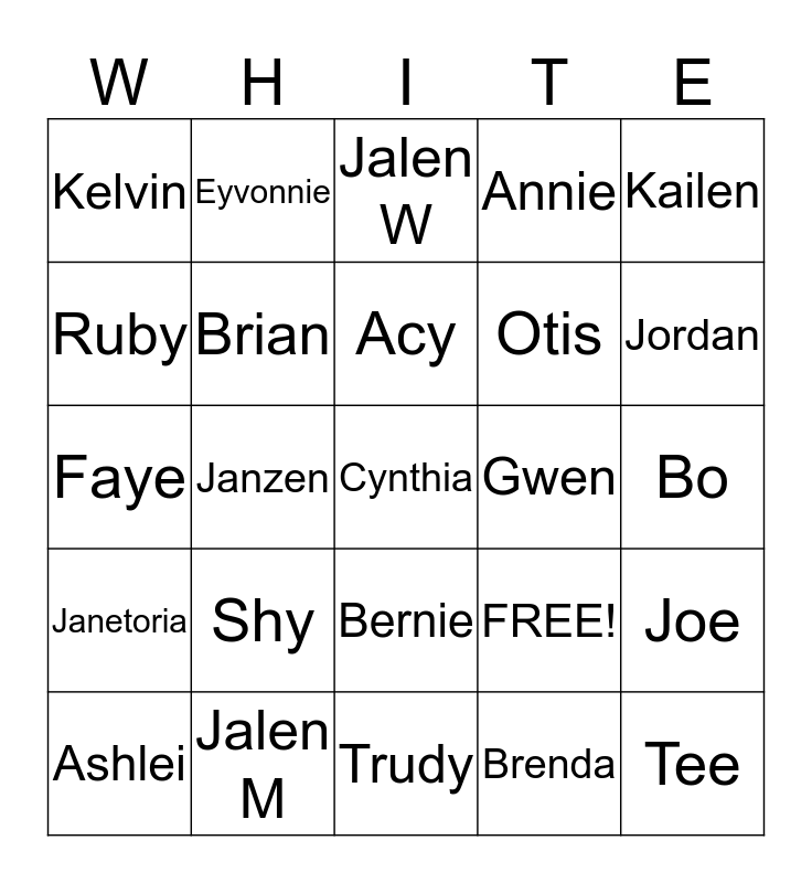 This bingo card has 25 words: Shy, Trudy, Acy, Ashlei, Kailen, Kelvin, Ruby, Eyvonnie, Gwen, Bernie, Otis, Faye, FREE!, Joe, Brian, Tee, Bo, Jalen W, Jordan, Janzen, Cynthia, Jalen M, Janetoria, Annie and Brenda.