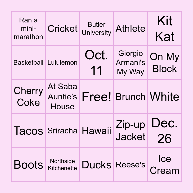This bingo card has a free space and 35 words: 5'4, Pink, 7, Lululemon, Hawaii, Athlete, Basketball, Tutoring, Oct. 11, Aug. 31, Cherry Coke, Kit Kat, Provider, Fashion Designer, Ran a mini-marathon, Brunch, Reese's, At Saba Auntie's House, Tacos, Ice Cream, Zip-up Jacket, Boots, Dec. 26, Northside Kitchenette, Butler University, On My Block, Rawalpindi, Pakistan, Gulab Jaman, Giorgio Armani's My Way, White, Black, Ducks, Sriracha, Cricket and Running.