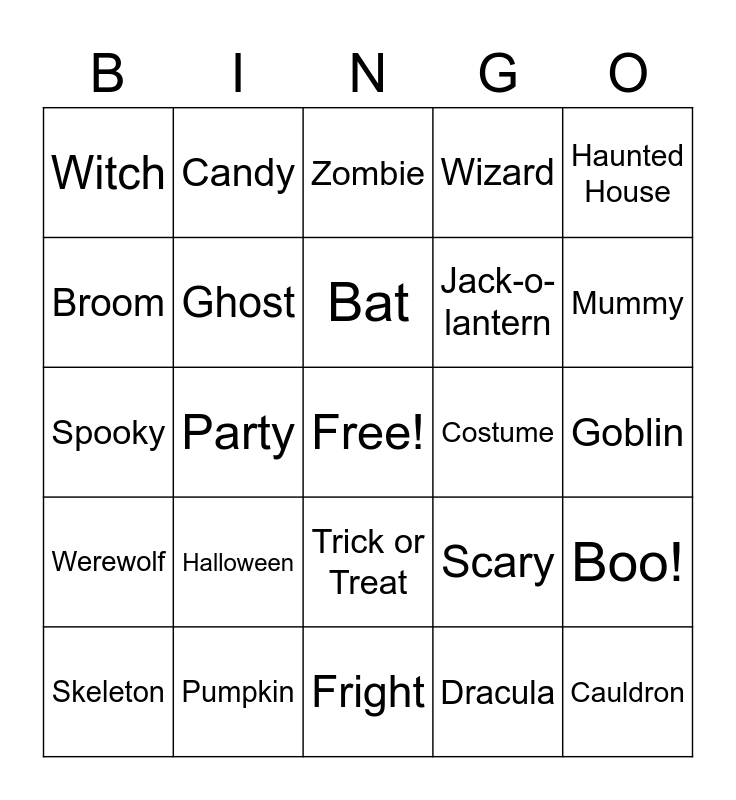 This bingo card has a free space and 24 words: Halloween, Pumpkin, Bat, Skeleton, Haunted House, Witch, Broom, Candy, Costume, Trick or Treat, Jack-o-lantern, Spooky, Scary, Boo!, Ghost, Dracula, Goblin, Zombie, Mummy, Party, Cauldron, Werewolf, Wizard and Fright.