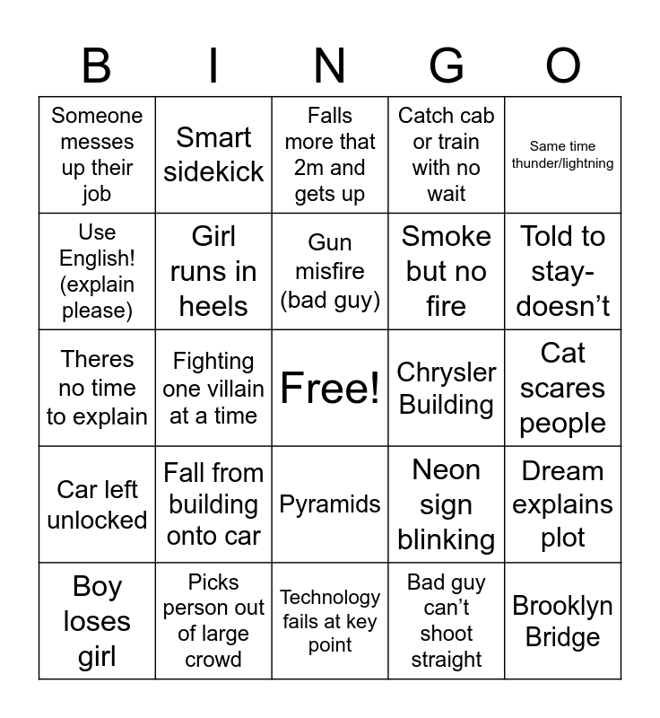 This bingo card has a free space and 55 words: Boy meets girl, Boy loses girl, Boy wins girl back again, Someone messes up their job, Technology fails at key point, Montage, Girl runs in heels, Crawl through air vent, Smoke but no fire, Bomb with timer, Catch cab or train with no wait, Car chase, French bread in bag, Pedestrian avoiding car, Swap clothes and they fit!, Heavy rain, Same time thunder/lightning, Fighting one villain at a time, Expensive apartment, Brooklyn Bridge, Chrysler Building, Empire State Building, Neon sign blinking, Falls more that 2m and gets up, Flashback, Gun misfire (bad guy), Bad guy can’t shoot straight, Good guy shot in shoulder, Cat scares people, Dream explains plot, Mirror used to scare, Don’t die on me!, Hold my hand!, Hacker only uses keyboard, Use English! (explain please), Theres no time to explain, Thick or complex document, Car left unlocked, Cops arrive in helicopter, Animal escapes unharmed, Smart sidekick, Child is smarter than adult, Last words from dying person, Car explodes when shot, Fall from building onto car, Picks person out of large crowd, Villian dies, Person picks a lock, Walks away from explosion, Told to stay- doesn’t, Blinking light in warehouse, Ties worn at the office, Eiffel Tower, Pyramids and Colosseum.