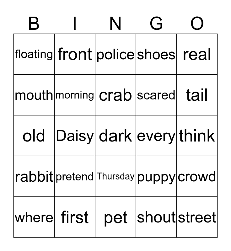 This bingo card has 50 words: when, dark, want, pet, pretend, always, front, afternoon, mouth, shop, morning, shoes, crowd, puppy, scramble, splash, crab, every, baby, real, Daisy, shout, floating, scared, free, street, tail, please, police, Thursday, them, tumble, hold, everyone, first, engine, family, sleep, past, think, highway, bird, wait, tongue, where, old, would, need, rabbit and quiet.