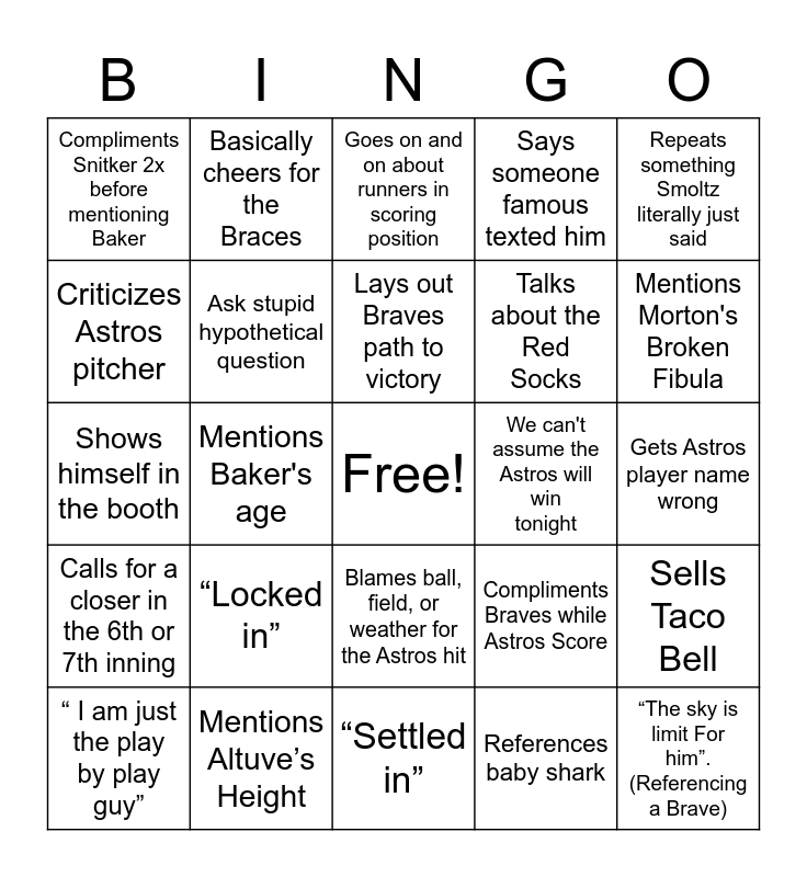This bingo card has a free space and 24 words: “Locked in”, Mentions Altuve’s Height, Lays out Braves path to victory, “ I am just the play by play guy”, Repeats something Smoltz literally just said, Compliments Snitker 2x before mentioning Baker, Criticizes Astros pitcher, Basically cheers for the Braces, We can't assume the Astros will win tonight, Blames ball, field, or weather for the Astros hit, Talks about the Red Socks, Shows himself in the booth, Compliments Braves while Astros Score, Sells Taco Bell, Ask stupid hypothetical question, References baby shark, Gets Astros player name wrong, Goes on and on about runners in scoring position, Mentions Morton's Broken Fibula, Mentions Baker's age, “The sky is limit For him”. (Referencing a Brave), Calls for a closer in the 6th or 7th inning, Says someone famous texted him and “Settled in”.