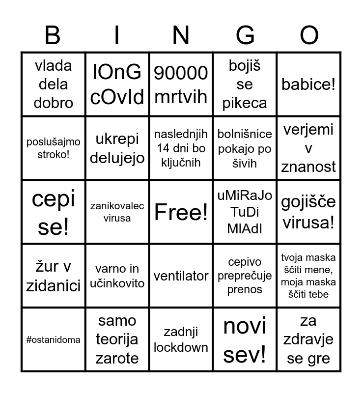 This bingo card has a free space and 24 words: varno in učinkovito, samo teorija zarote, naslednjih 14 dni bo ključnih, #ostanidoma, babice!, vlada dela dobro, poslušajmo stroko!, lOnG cOvId, uMiRaJo TuDi MlAdI, ventilator, bolnišnice pokajo po šivih, cepi se!, cepivo preprečuje prenos, tvoja maska ščiti mene, moja maska ščiti tebe, ukrepi delujejo, novi sev!, gojišče virusa!, 90000 mrtvih, verjemi v znanost, zanikovalec virusa, za zdravje se gre, žur v zidanici, bojiš se pikeca and zadnji lockdown.