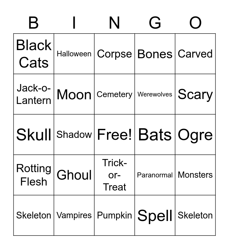 This bingo card has a free space and 50 words: Ghost, Skeleton, All Hallows Eve, Pumpkin, Ghoul, Cauldron, Halloween, Cobweb, Jack-o-Lantern, Coffin, Moon, Bones, Monsters, Paranormal, Frankenstein, Witches, Cemetery, Bats, Blood, Carved, Shadow, Spell, Black Cats, Werewolves, Wraith, Goblin, Scary, Evil, Corpse, Trick-or-Treat, Costume, Haunted House, Demon, Superstition, Vampires, Gruesome, Spider, Candy, October, Ogre, Party, Potion, RIP, Scarecrow, Skeleton, Skull, Dracula, Zombies, Rotting Flesh and Eerie.