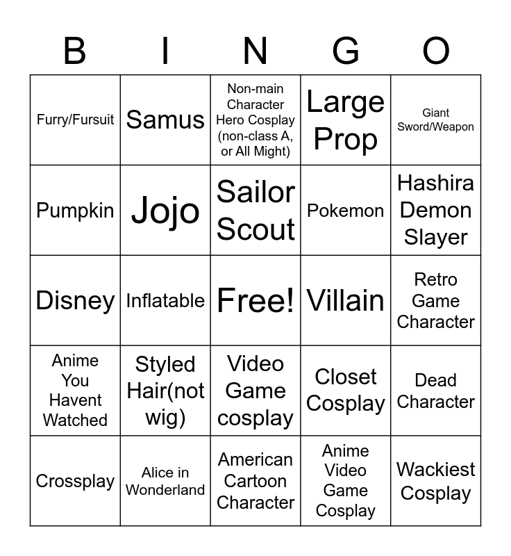 This bingo card has a free space and 26 words: Video Game cosplay, Anime Video Game Cosplay, Sailor Scout, Alice in Wonderland, Giant Sword/Weapon, Furry/Fursuit, Pumpkin, Samus, Retro Game Character, Closet Cosplay, Pokemon, Disney, Dead Character, Crossplay, Inflatable, Onsie/Kigurumi, Large Prop, Anime You Havent Watched, Non-main Character Hero Cosplay (non-class A, or All Might), Wackiest Cosplay, Hashira Demon Slayer, American Cartoon Character, Villain, Styled Hair(not wig), Jojo and Meme cosplay.