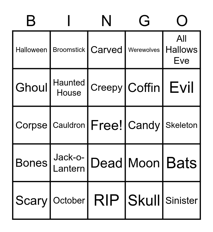This bingo card has a free space and 68 words: Grave, Sinister, Spooky, Alien, Bogeyman, Mist, Broomstick, Chilling, Creepy, Dark, Dead, Ghost, Skeleton, All Hallows Eve, Pumpkin, Ghoul, Cauldron, Halloween, Cobweb, Jack-o-Lantern, Coffin, Moon, Bones, Monsters, Paranormal, Frankenstein, Witches, Cemetery, Bats, Blood, Carved, Shadow, Spell, Black Cats, Werewolves, Wraith, Goblin, Scary, Evil, Corpse, Trick-or-Treat, Costume, Haunted House, Demon, Superstition, Vampires, Gruesome, Spider, Candy, October, Ogre, Party, Potion, RIP, Scarecrow, Skeleton, Skull, Dracula, Zombies, Rotting Flesh, Eerie, Eyeballs, Fangs, Fairy, Fear, Haunt, Hocus Pocus and Mummy.