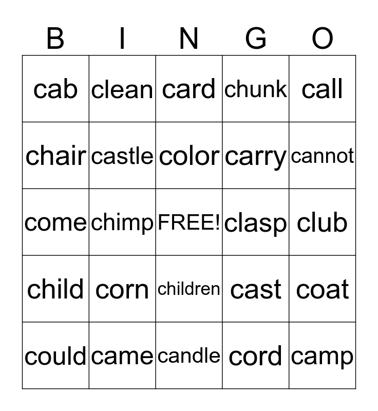 This bingo card has a free space and 31 words: candle, candy, chimp, can, cab, card, castle, cast, clasp, cord, club, camp, clap, can't, cannot, cow, coat, corn, child, children, call, cold, could, clean, carry, chair, chunk, come, came, color and chicken.