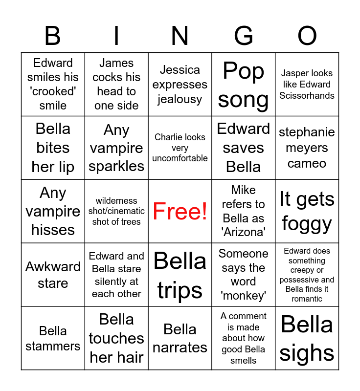 This bingo card has a free space and 24 words: Edward and Bella stare silently at each other, Bella touches her hair, Charlie looks very uncomfortable, Bella stammers, Jasper looks like Edward Scissorhands, Edward smiles his 'crooked' smile, Bella bites her lip, James cocks his head to one side, Mike refers to Bella as 'Arizona', Bella trips, Edward saves Bella, Any vampire hisses, Someone says the word 'monkey', Edward does something creepy or possessive and Bella finds it romantic, Any vampire sparkles, A comment is made about how good Bella smells, It gets foggy, Jessica expresses jealousy, stephanie meyers cameo, wilderness shot/cinematic shot of trees, Bella sighs, Awkward stare, Pop song and Bella narrates.