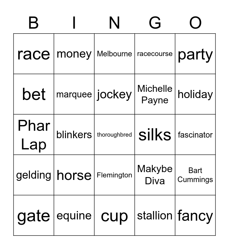 This bingo card has 25 words: horse, cup, jockey, gate, party, race, bet, money, silks, Flemington, Michelle Payne, Phar Lap, Makybe Diva, Bart Cummings, marquee, fancy, fascinator, Melbourne, holiday, blinkers, thoroughbred, equine, gelding, racecourse and stallion.