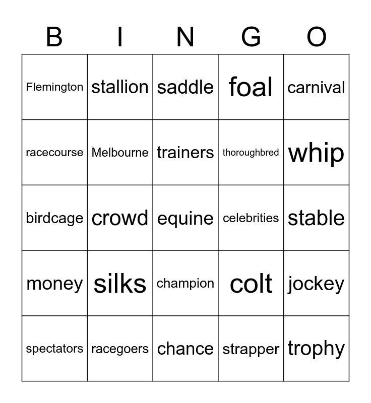 This bingo card has a free space and 24 words: silks, racegoers, trainers, spectators, carnival, Flemington, racecourse, stallion, celebrities, champion, thoroughbred, birdcage, colt, jockey, Melbourne, strapper, stable, saddle, whip, crowd, trophy, money, foal and chance.