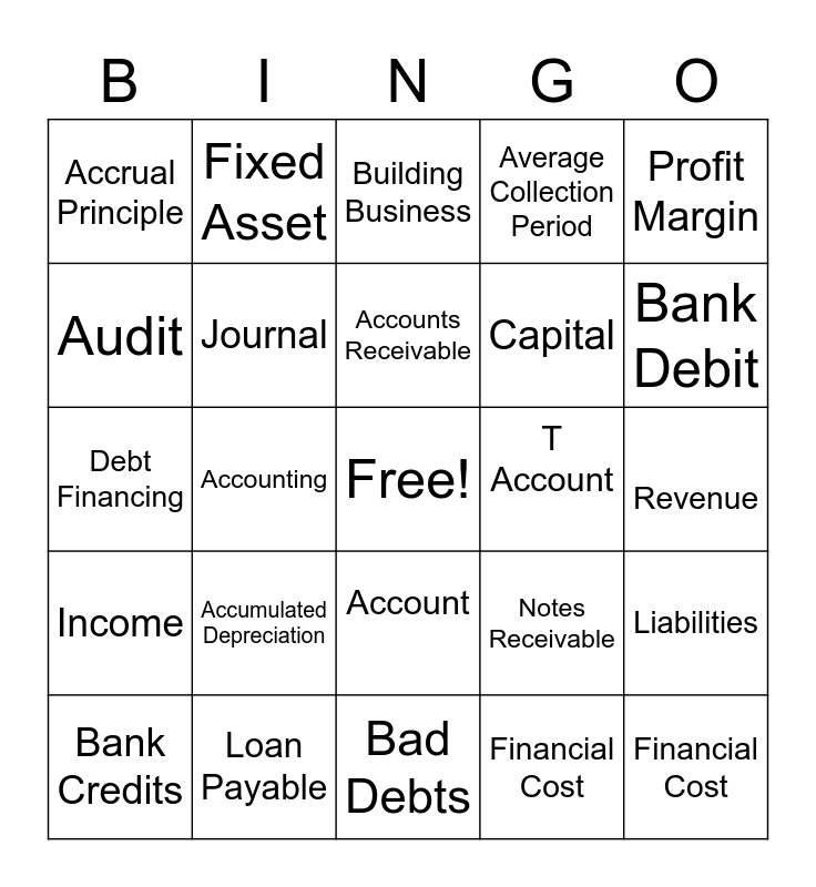 This bingo card has a free space and 24 words: Bank Credits, Accumulated Depreciation, Accounts Receivable, Financial Cost, Profit Margin, Accrual Principle, Fixed Asset, Building Business, T Account, Revenue, Debt Financing, Journal, Notes Receivable, Liabilities, Audit, Loan Payable, Bad Debts, Average Collection Period, Bank Debit, Income, Accounting, Account, Capital and Financial Cost.