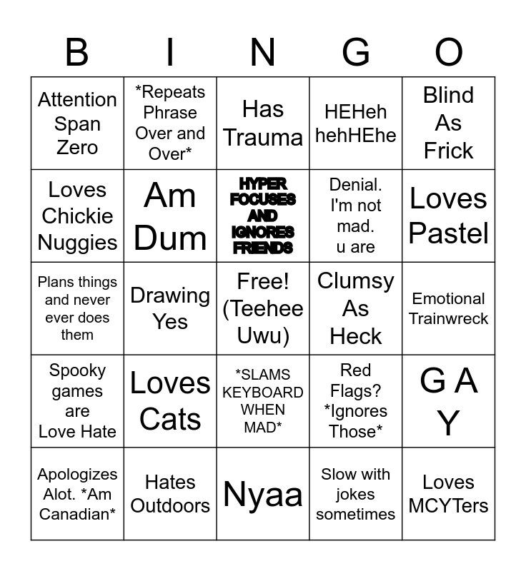 This bingo card has a free space and 24 words: Loves Cats, Hates Outdoors, HYPER FOCUSES AND IGNORES FRIENDS, Apologizes Alot. *Am Canadian*, Blind As Frick, Attention Span Zero, Loves Chickie Nuggies, *Repeats Phrase Over and Over*, Clumsy As Heck, *SLAMS KEYBOARD WHEN MAD*, Denial. I'm not mad. u are, Plans things and never ever does them, Red Flags? *Ignores Those*, G A Y, Am Dum, Slow with jokes sometimes, Emotional Trainwreck, Has Trauma, Loves Pastel, Drawing Yes, Loves MCYTers, Spooky games are Love Hate, HEHeh hehHEhe and Nyaa.