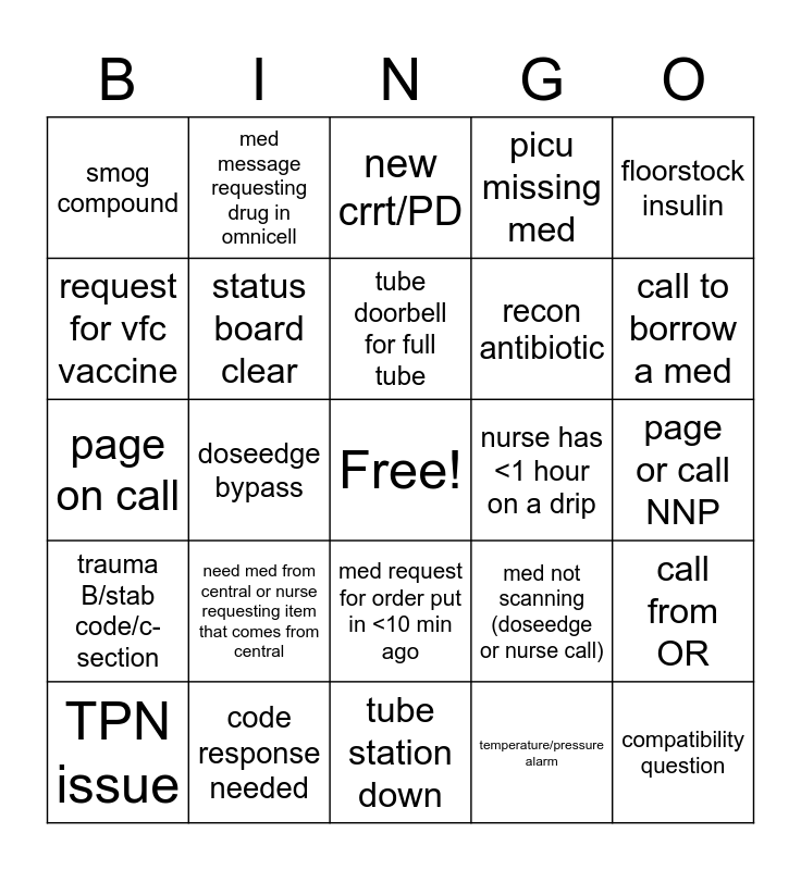 This bingo card has a free space and 43 words: missing lipid/adjust lipid time, compatibility question, call out/or >10 min late, TPN issue, stat alteplase, temperature/pressure alarm, new crrt/PD, missing insulin, floorstock insulin, code response needed, picu missing med, nurse has <1 hour on a drip, med request for order put in <10 min ago, need med from central or nurse requesting item that comes from central, fast mover out of stock, tube station down, miss-filled med, page on call, retail (break-in, counseling, nurse calling wrong #), call to borrow a med, med message requesting drug in omnicell, need new tackle box, expired compound, smog compound, premix station with >6 to prep, page or call NNP, med sent secure returns in tube, omnicell discrepancy, med not scanning (doseedge or nurse call), trauma B/stab code/c-section, expired med (not compound), call from OR, new DKA needs bags STAT, doseedge bypass, brand new TPN, new LOS/EOS orders, call from outside pharm to borrow med, tube doorbell for full tube, request for vfc vaccine, recon antibiotic, ID home med, status board clear and new item for extemp board.